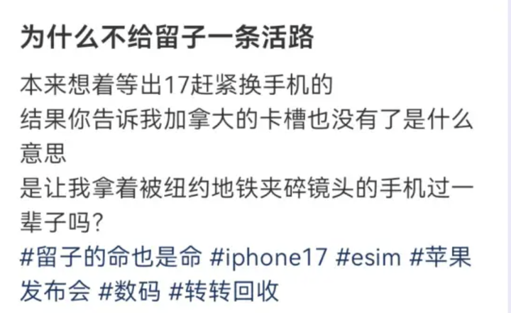 隔壁美国从iPhone14开始就取消了卡槽,不少美国留子和华人都是在加拿大买的iPhone,这次加拿大改版,慌的可不止加拿大华人。