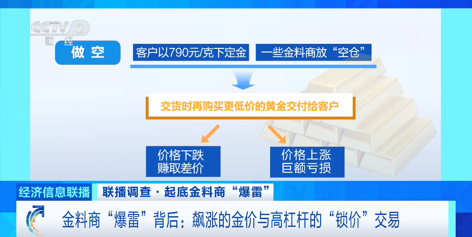 以做空交易为例,客户以790元/克的价格锁价下定金,一些金料商预计金价会下跌,不实时购入对应价格的黄金交货,而是放“空仓”,等交货时再购买更低价的黄金交付给客户。如价格按预期下跌,金料商可以获得其中差价盈利。然而,近期,国际金价屡创新高,远超他们收取预付款时的价格,巨大的缺口使其根本无法交付实物。