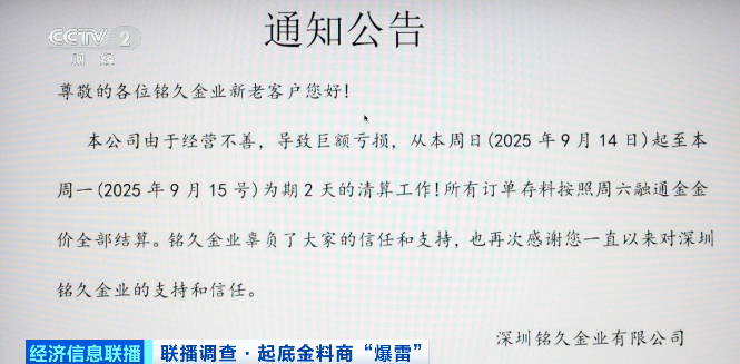 目前已有多家黄金原料供应商在网上发公告,称公司由于经营不善,导致巨额亏损,正在进行清算工作。所有订单存料按照9月13日,融通金金价全部结算。
