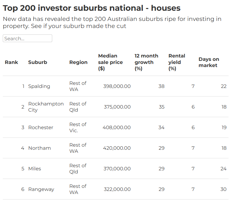 具体到排名靠前的区域,西澳的Spalding荣登榜首。这里的独立屋中位价为398,000澳元,租金回报率达7%,过去一年房价上涨38%,平均22天即可出租。