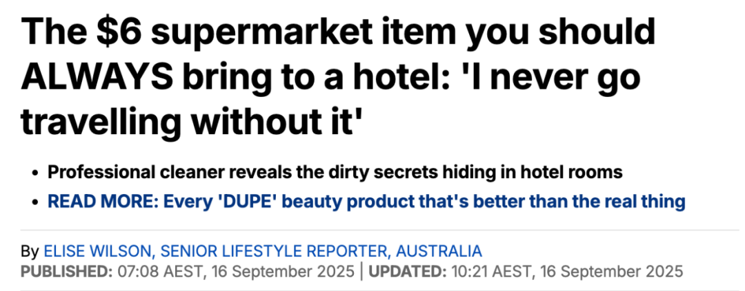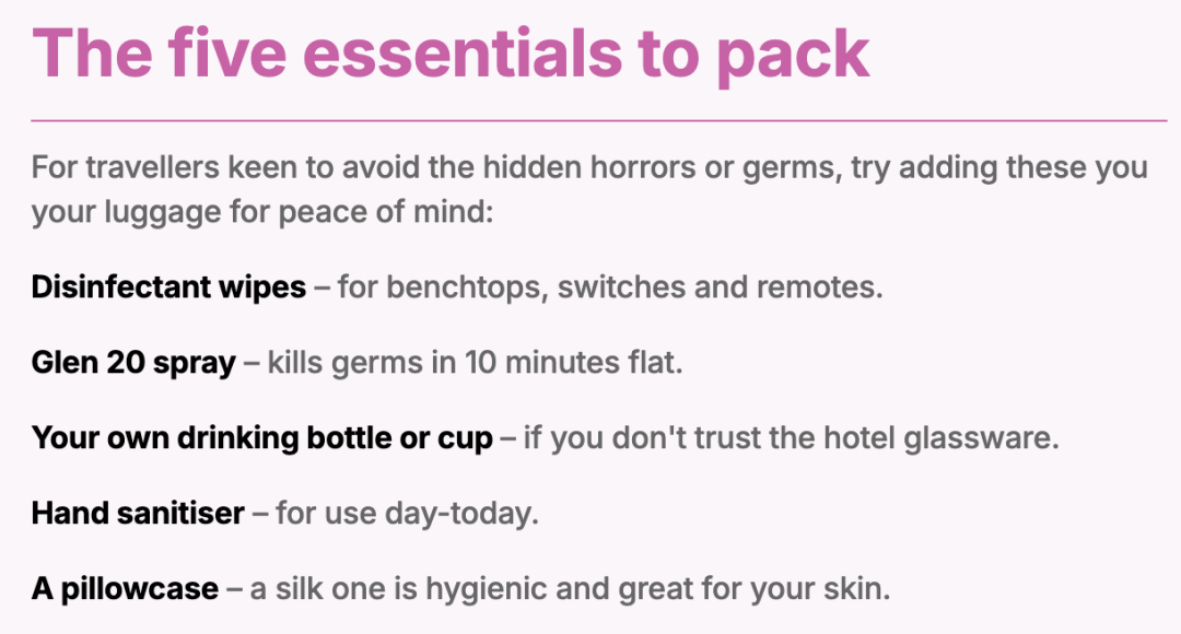 因此,她强烈建议旅客随身携带一套“小型清洁装备”,尤其是 超市 6 澳元的消毒湿巾,比如 Coles 或 Woolworths 的 Pine O Cleen,她自己每次出行都会带上。