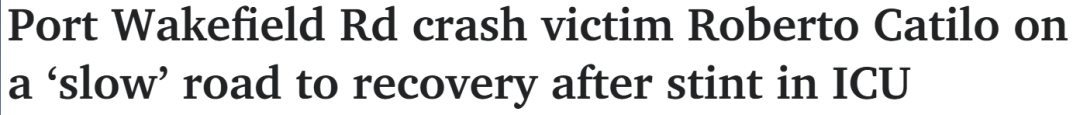 Port Wakefield车祸受害者家人更新近况:42岁的 Roberto Catilo 仍在与死神搏斗。上周一,他在 Port Wakefield Rd 驾车时因狂风失控,车辆翻滚撞树重伤,被紧急送往皇家阿德莱德医院,腿部多处骨折、手臂骨折并伴有眼室综合征。经过一周治疗,他已从重症监护室转入普通病房,左臂恢复活动,能自行进食,右臂也可辅助活动。哥哥 Gary 形容这是“巨大突破”。