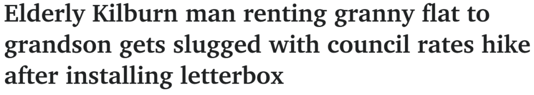 Kilburn 一家人因在房前安装了一个 15 澳元的信箱,市政税意外上涨约 500 澳元,从 1900 澳元涨到 2400 澳元。76 岁的 Branislav Jankovic 将后院granny flat租给孙子,孙子为避免邮件送到已出租的主屋,去 Bunnings 买了单独的信箱。Port Adelaide Enfield Council 接到举报后调查,由 Office of the Valuer General 重新评估后院的granny flat ,按独立房产征收第二笔市政费。