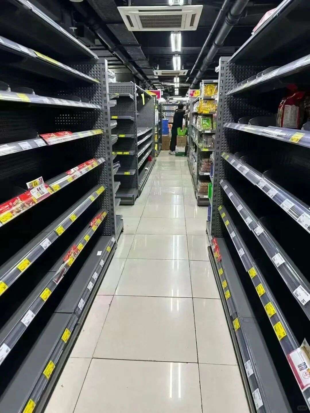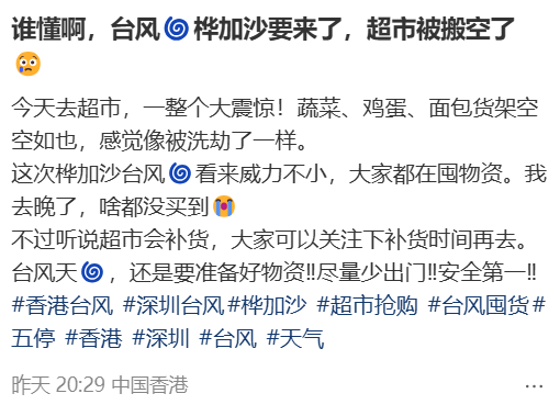 香港、广州、珠海、深圳等多地居民也开始提前囤积物资,超市货架空空如也,被一抢而空。