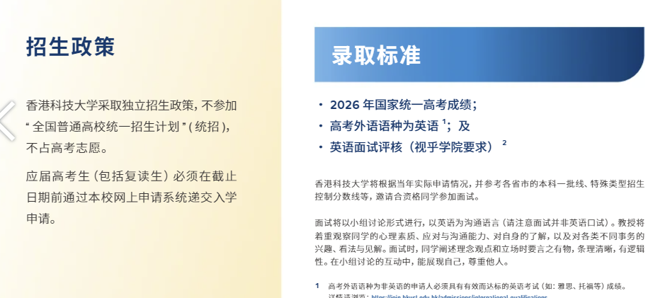 更值得注意的是,香港科技大学也早已退出统招体系。在其2026年招生简章中,明确写明:“港科大不参加统招,不占高考志愿,实行独立招生”。两所主力高校相继“脱离高考系统”,是否预示着香港名校正在集体与“分数决定论”告别?