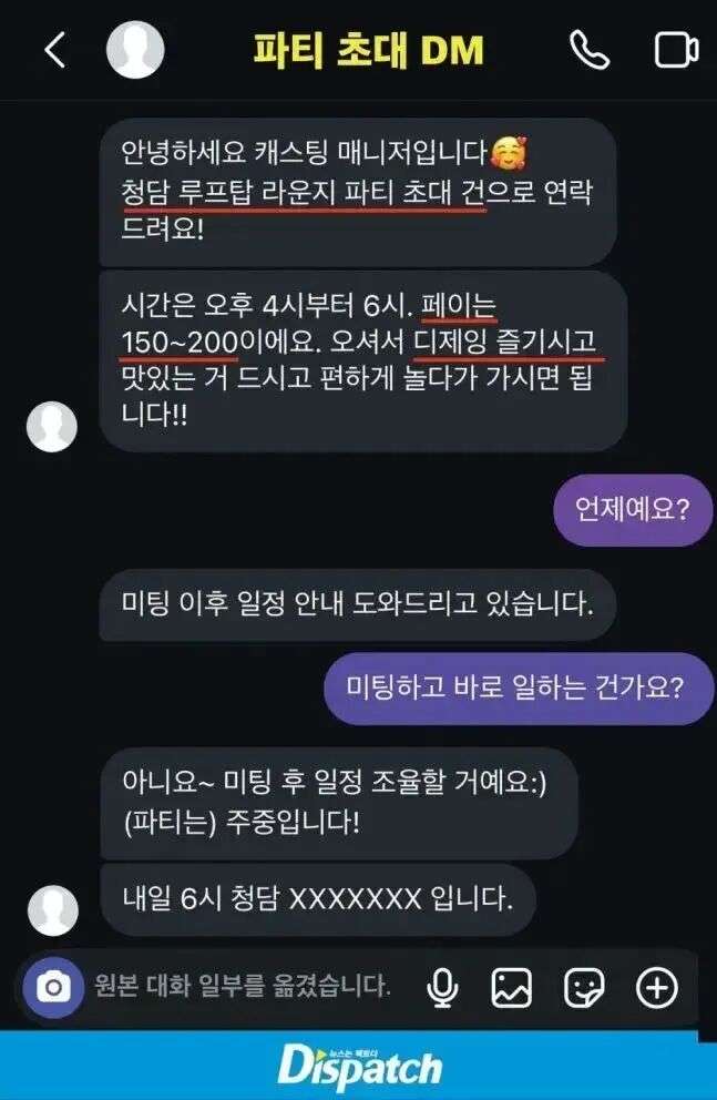 邀约的“经理人”会通过KakaoTalk细致安排。首先精挑细选一些女性,发信息询问“我们周末前要确定派对人数,您能来吗?”