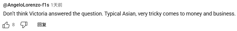 “我觉得她并没有真正回答问题,典型的亚洲人,脑子里都是生意和钱。”