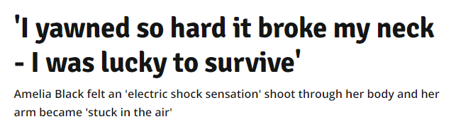 最初的检查未发现异常,但随后医生确认,她在打哈欠时过度用力,导致颈部第6、第7节颈椎严重错位,压迫脊椎并发生骨折。