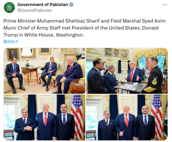 会谈后,巴基斯坦政府的官方X账号发布了四张会谈照片:在合影环节,特朗普面带微笑,竖起了标志性的大拇指。