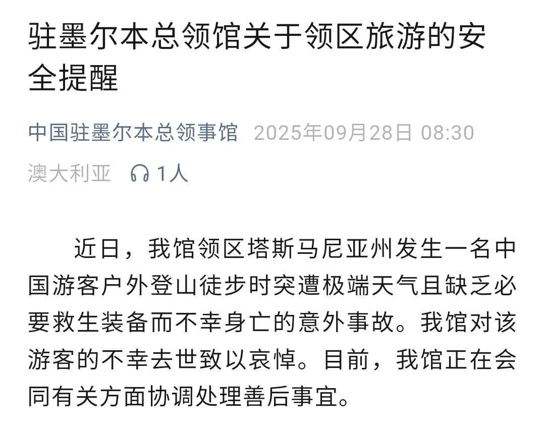 近日,我馆领区塔斯马尼亚州发生一名中国游客户外登山徒步时突遭极端天气且缺乏必要救生装备而不幸身亡的意外事故。我馆对该游客的不幸去世致以哀悼。目前,我馆正在会同有关方面协调处理善后事宜。