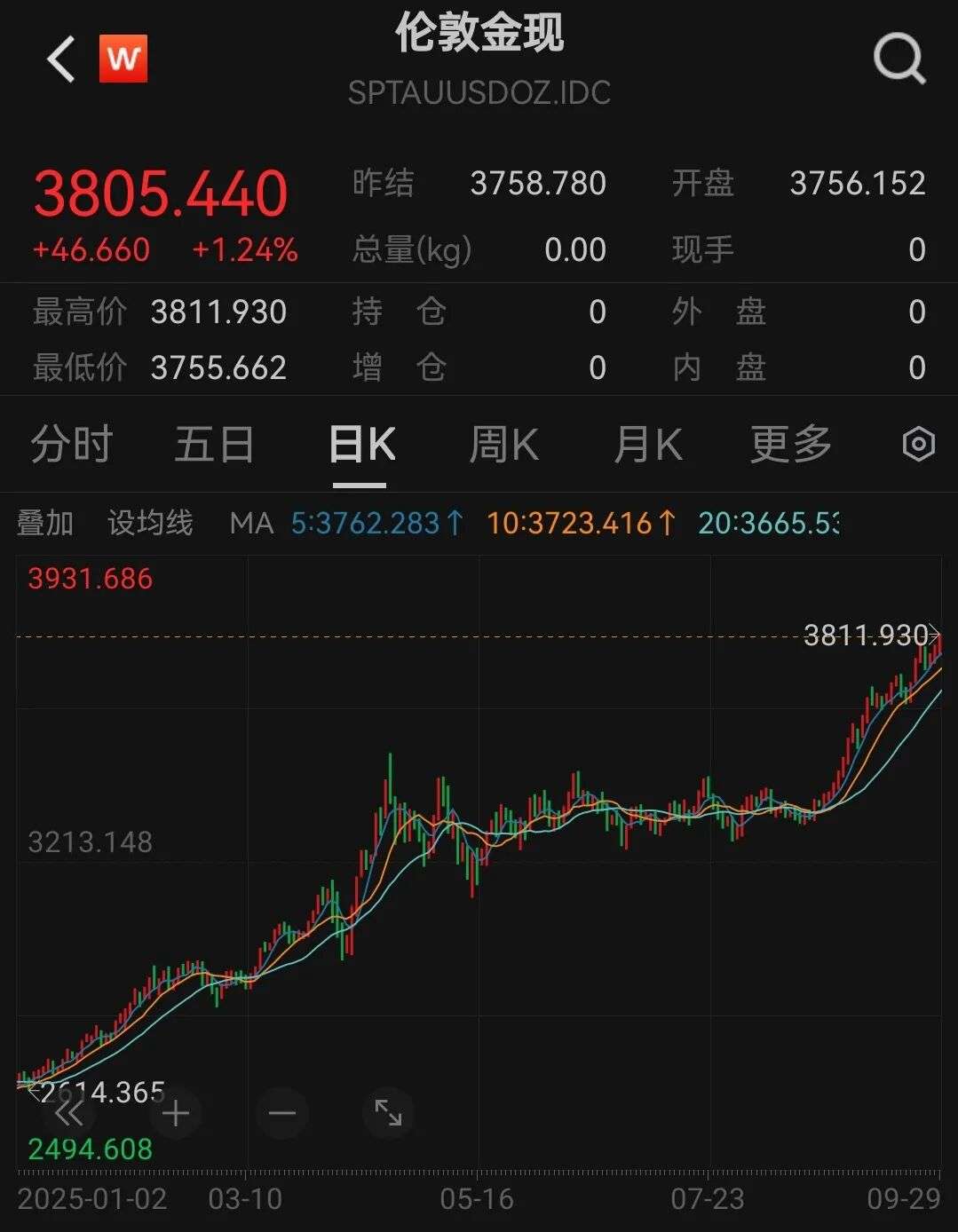 现货黄金盘中突破3800美元/盎司,续创历史新高,日内涨超1%。今年以来累计上涨近45%。