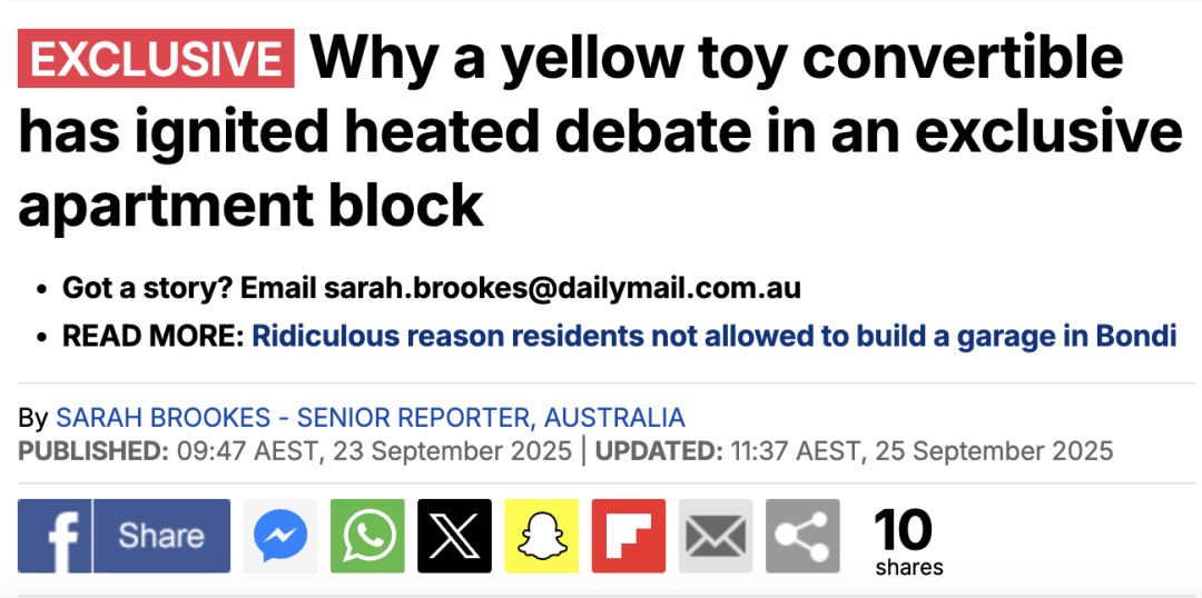 最近,悉尼东区Bondi Junction的一栋高档公寓就因为一辆小小的儿童电动玩具车掀起了一场全城热议。