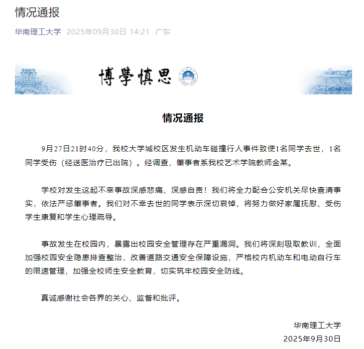 收藏华南理工大学通报“校内车祸致1死1伤”:肇事者系艺术学院教师金某,学校全力配合公安机关尽快查清事实
