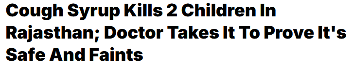 印度一药企凯森制药公司(Kaysons Pharma)生产的止咳糖浆出现严重问题,2名儿童死亡,至少10人患病。