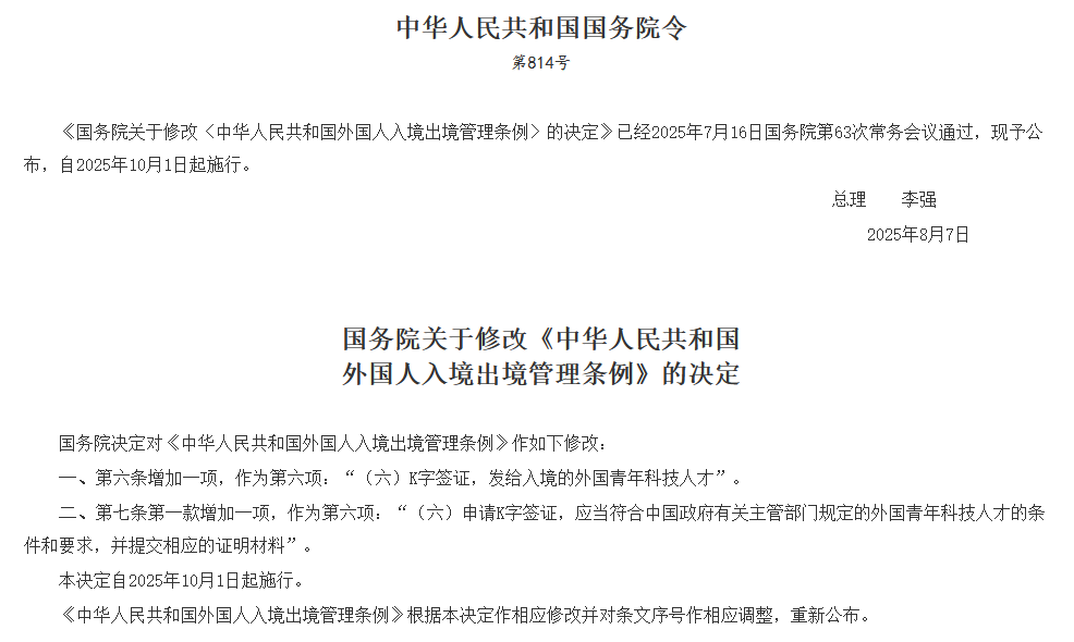 根据中国国务院公布的最新公告,10月1日起,新增“K字签证”,颁发给“入境的外国青年科技人才”。