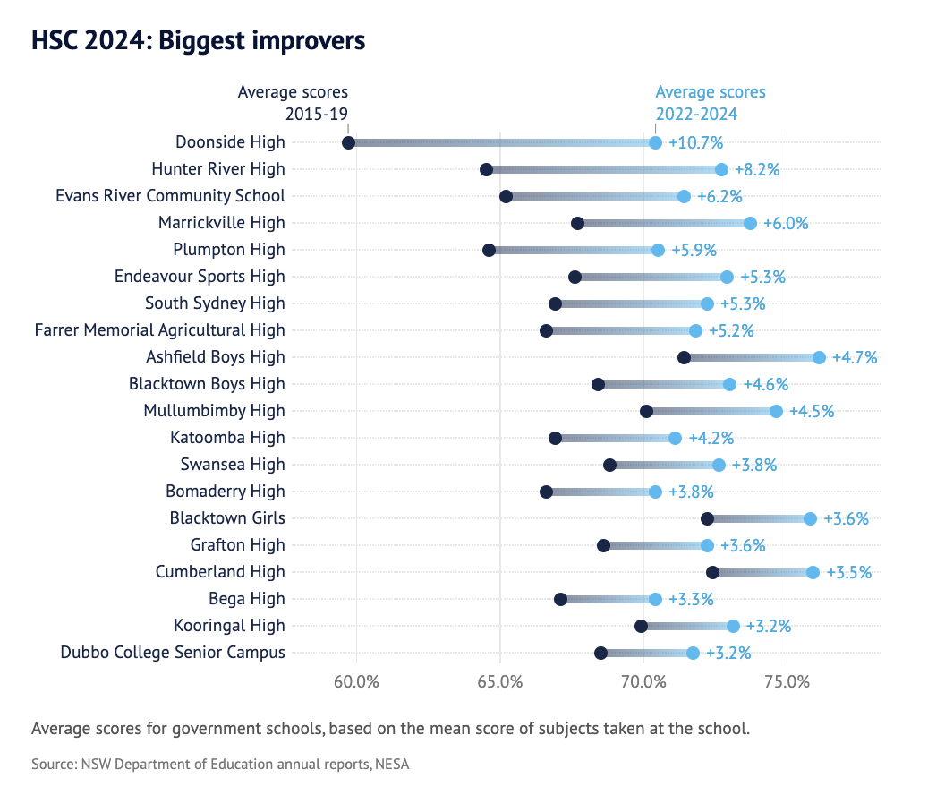 过去十年进步最大的学校是 Doonside High,平均分提升了 11 分,超过了 70 分。