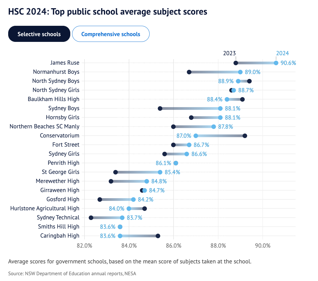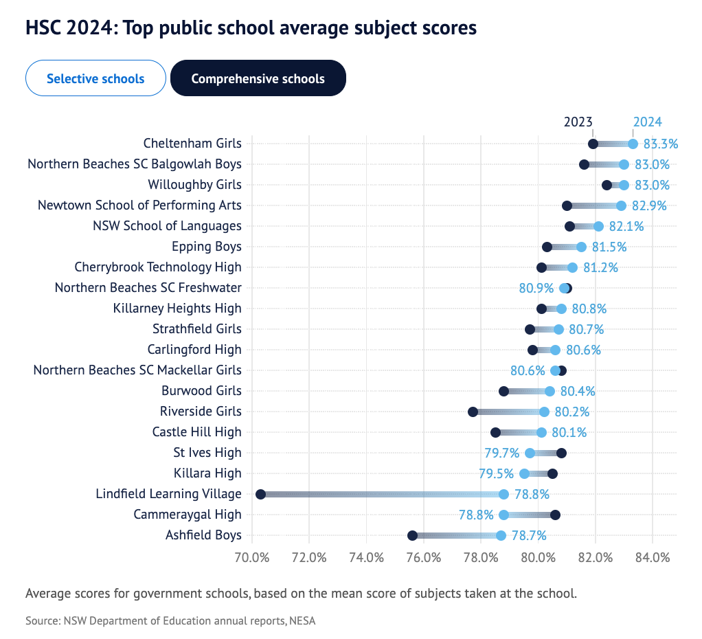 Cheltenham Girls、Balgowlah Boys 和 Willoughby Girls (前三甲)去年表现最佳,平均分都在 81 分以上,超过了 Newtown Performing Arts School 和 Epping Boys。