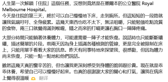 据当事人描述,抵达Royal Melbourne Hospital医院后,医疗团队立即进行了清创及胸腔引流手术,才得以度过难关。