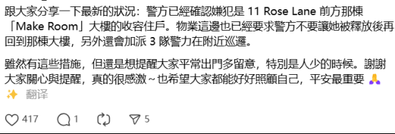 据警方透露,嫌犯是11 Rose Lane前方“Make Room”大楼的收容住户。