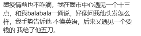 也有网友直言,如今墨尔本治安实在令人担忧。有人当街遇到乞讨者,也有人提及一名日本女生深夜遭无家者殴打抢劫,导致住院多日。