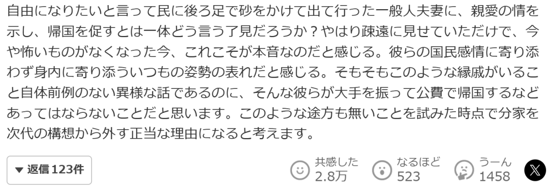 这不过是他们一贯的作风——不顾国民情感,只顾庇护亲信。拥有这样的亲属关系本身就是前所未有的异常现象,更遑论让他们大摇大摆地动用公费回国——这绝不可容忍。”