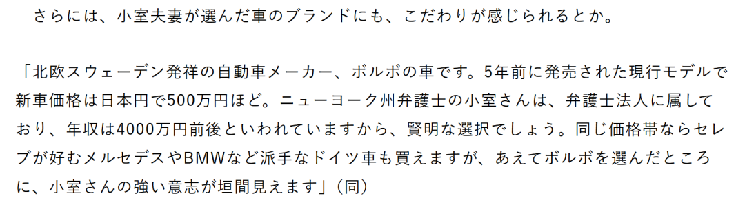 比如9月中旬的报道里就说了一顿小室圭的车,说两人选择了沃尔沃而不是奔驰宝马也不是日系车,说明两人更注重实用,透露出个人坚定的意志。
