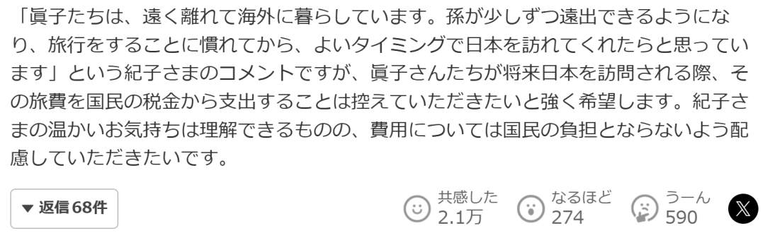 对此,我强烈希望未来真子她们访日时,其旅费能避免使用国民税金支付。虽然理解纪子妃的温暖心意,但希望在费用方面能避免给国民造成负担。”