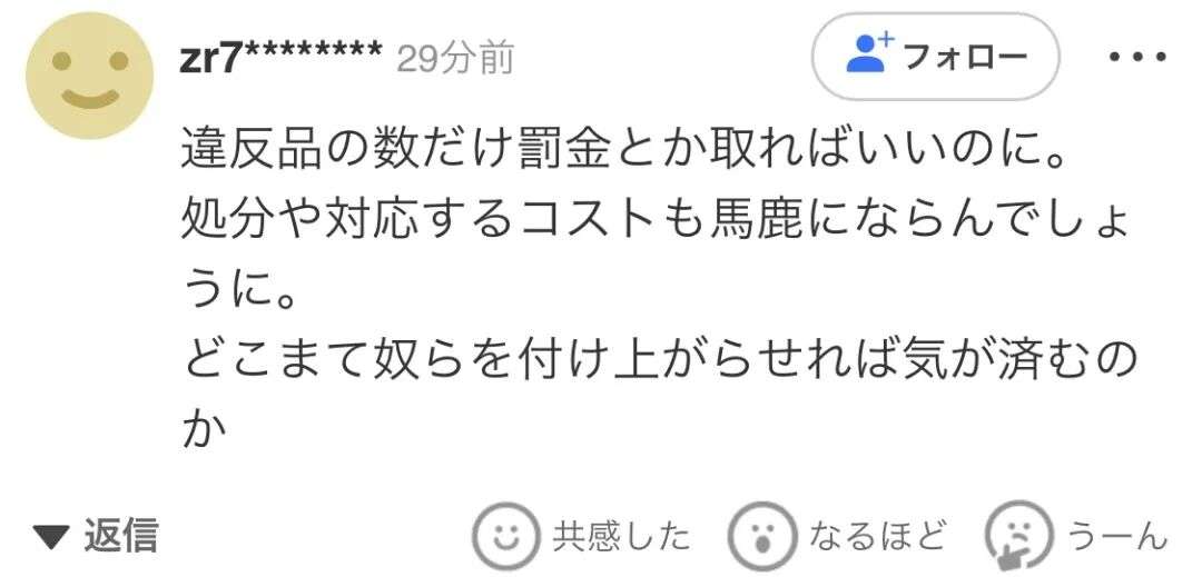 “要按违禁物品的数量来罚款就好了。处理和处置的成本也不是小数目吧。他们还要被放任到什么时候才会罢休?”