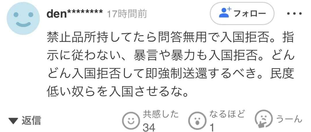 “如果携带违禁品就一律拒绝入境。不服从指示、口出恶言或施暴的也要拒绝入境。应该不断拒绝入境并立即强制遣返。别让那些素质低下的人进来。”