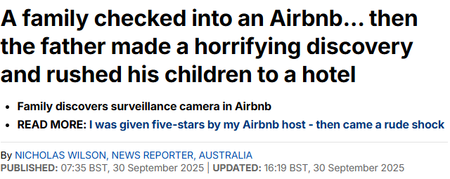 据《每日邮报》9月30日报道,一家人在入住Airbnb后惊讶地发现房内有摄像头,不得不立即搬到酒店。