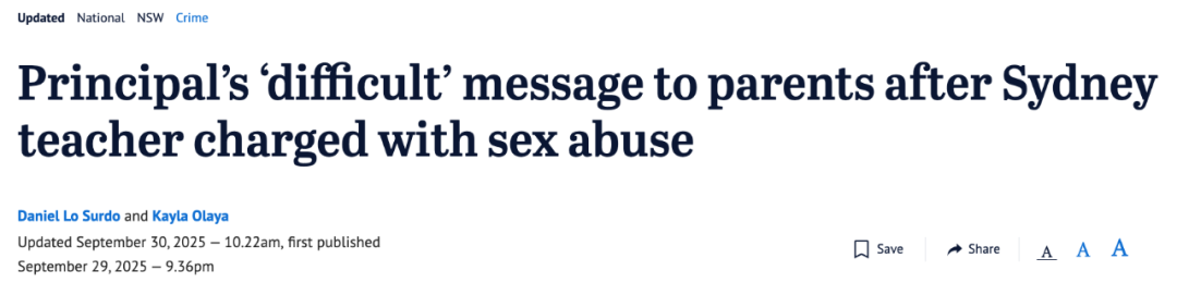 据悉,悉尼一名24岁教师因涉嫌对一名15岁学生实施多项性侵罪被起诉,学校校长在致家长的信中表示,这起事件“极度令人痛心”,并承认它将对整个社区造成极坏影响。