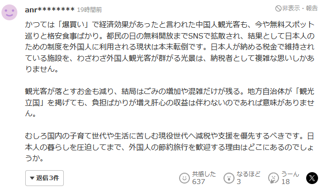 倒不如优先考虑国内育儿家庭和打工人的减税和支持。压迫日本人的生活空间,欢迎外国人的节约旅行,这有什么道理呢?