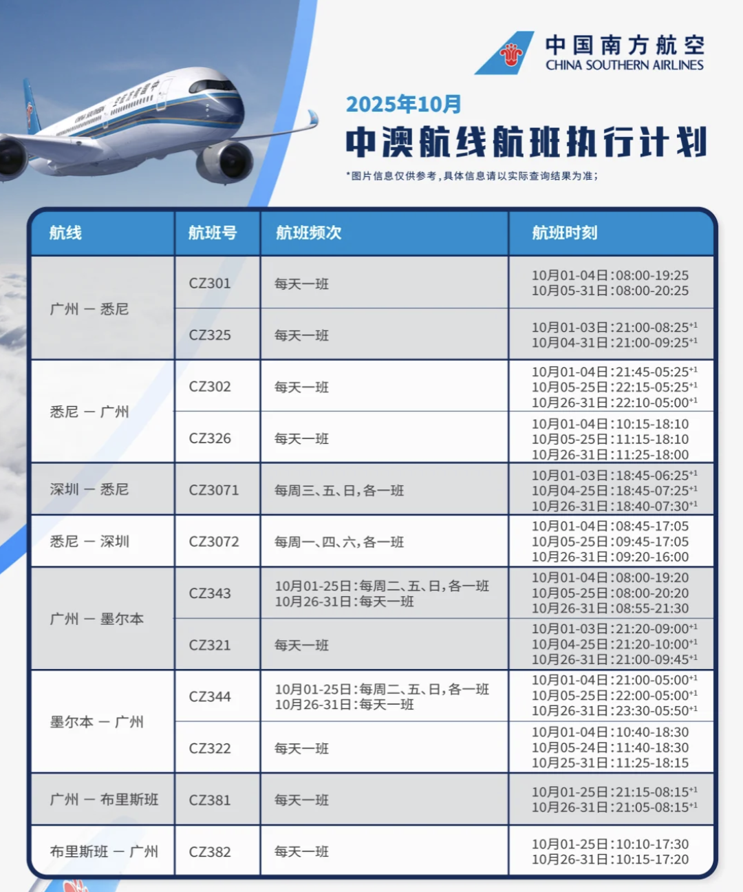 收藏中国南方航空2025年10月中澳航线计划,将执飞悉尼、墨尔本、布里斯班航线,新航季悉尼将调整值机柜台
