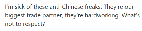 “我受够了这些针对中国的偏见,中国是我们最大的贸易合作伙伴,中国人很勤劳,为什么不能多点尊重?”