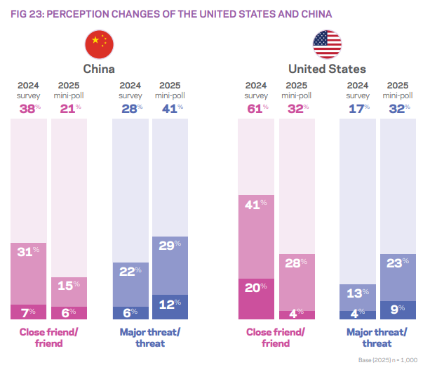 然而,到了2025年3月,这一比例此消彼长:认为中国是朋友的比例降至21%,而认为中国构成威胁的比例上升至41%。