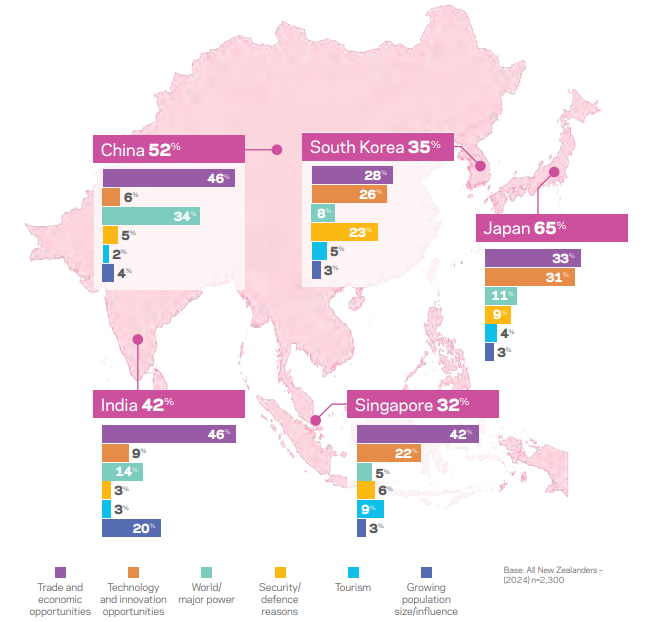 2024年,新西兰人中有38%认为中国是朋友,28%认为是威胁。