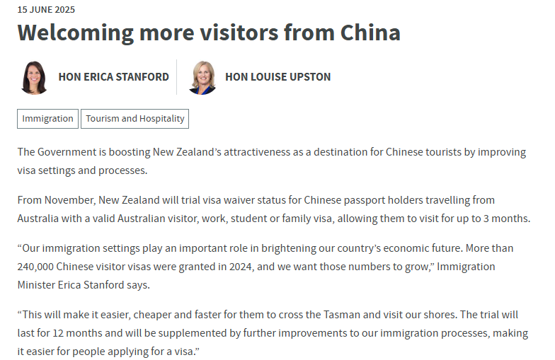 新西兰移民部长和旅游部长今年发布联合公告“欢迎中国游客”,指出希望他们“更轻松、更便宜、更快捷地来到新西兰”。