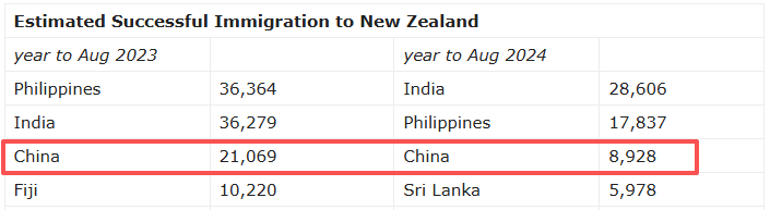 2022–2023年,中国成功移民新西兰的约21,069 人,到了2023–2024年骤降至8,928人。