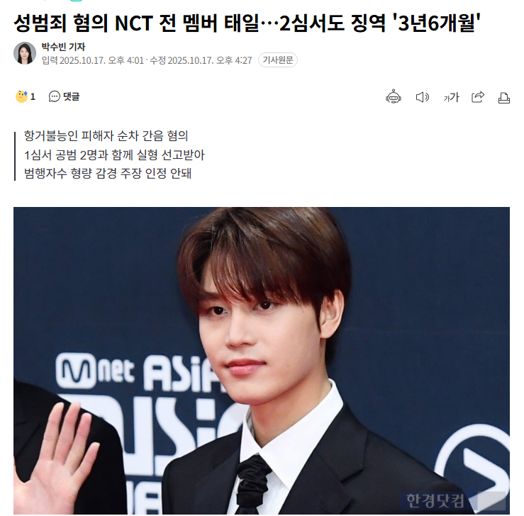 据韩国媒体报道,因涉嫌强奸醉酒中国女游客而被起诉的偶像组合NCT前成员文泰一在二审中被判处有期徒刑3年6个月。