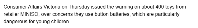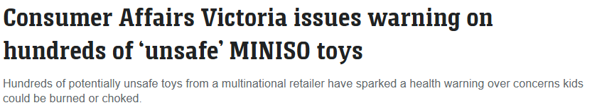 根据官方公告,维州消费者事务局在近期检查中发现,MINISO(名创优品)在维州17家门店及新州5家门店内,共有约400款玩具被认定为“潜在不安全产品”!