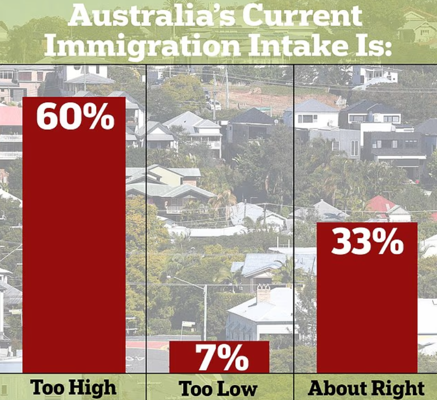 高达60%的澳大利亚人认为当前移民水平过高,仅有7%的受访者觉得移民数量过低,另外33%认为移民规模“适中”。