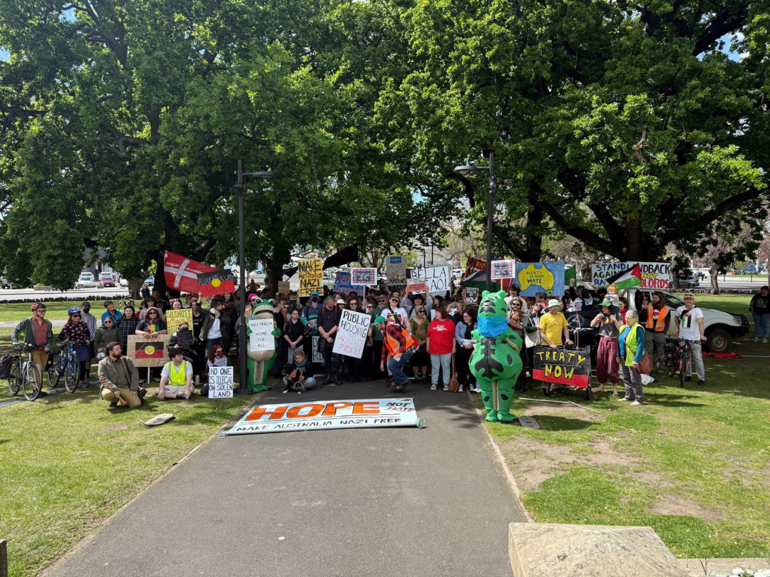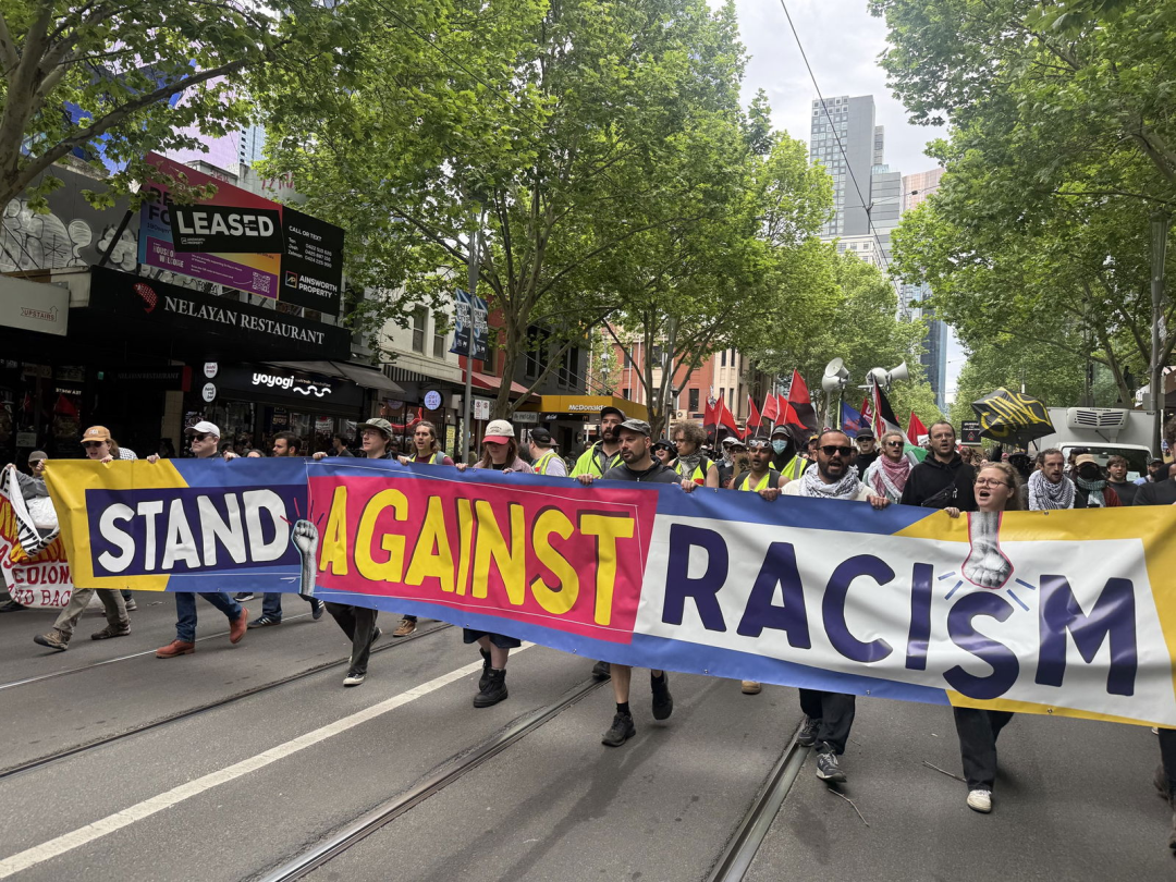 墨尔本的反种族主义集会可见标语写着“责怪资本主义,而非移民”和“同性恋、异性恋、黑人、白人,团结起来阻止极右翼”。