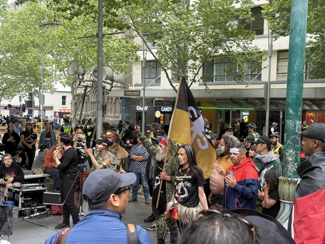 当示威者在严密监视下穿过城市时,警方封锁了Elizabeth St的部分路段。