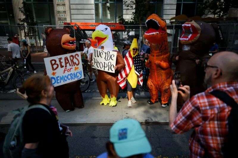 不只是青蛙,那些受到启发的美国示威者也会把自己装扮成恐龙或是其他卡通形象。