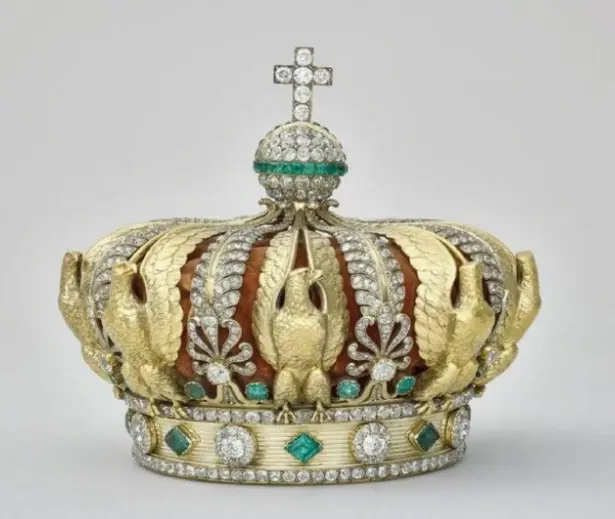 皇冠总共使用了56颗祖母绿和1354颗钻石,又靠黄金做出帝国双头鹰与繁复的花叶纹样,光是宝石本身就价值数千万欧元,更不要说其历史意义。