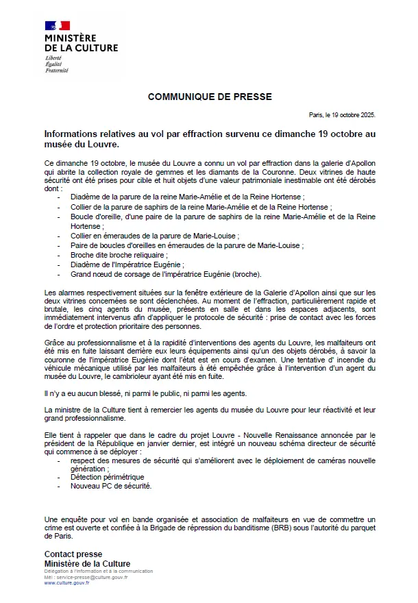 目前,法国警方和文化部尚未公布任何嫌犯身份,不排除“外国犯罪团伙”的可能性。
