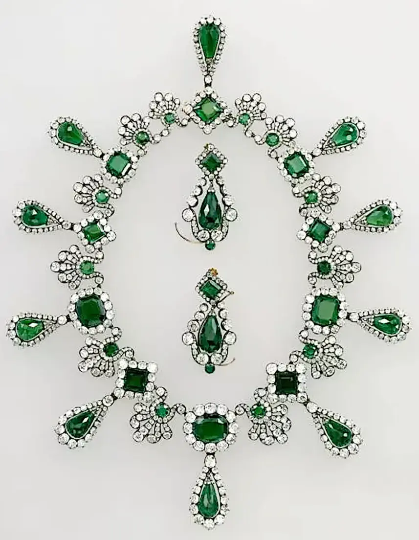 这套珠宝是拿破仑1810年赠予来自奥地利的皇后婚礼礼物,包括 32 颗精心切割的祖母绿和 1,138 颗钻石。