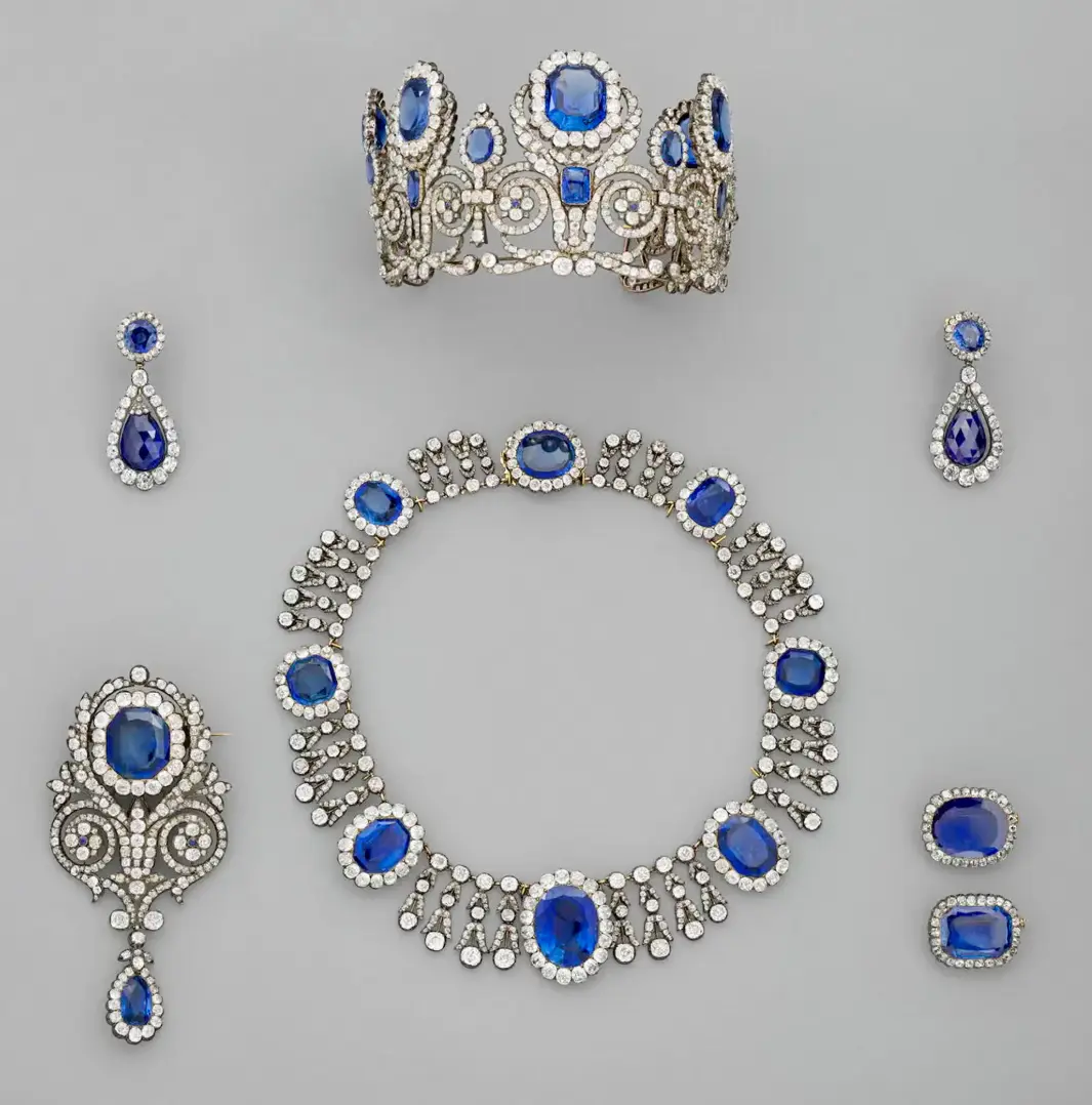 玛丽-阿梅莉是路易-菲利普国王的王后,这组蓝宝石饰品是十九世纪法国皇室最具代表性的珠宝之一,由 8 颗蓝宝石和 631 颗钻石组成。