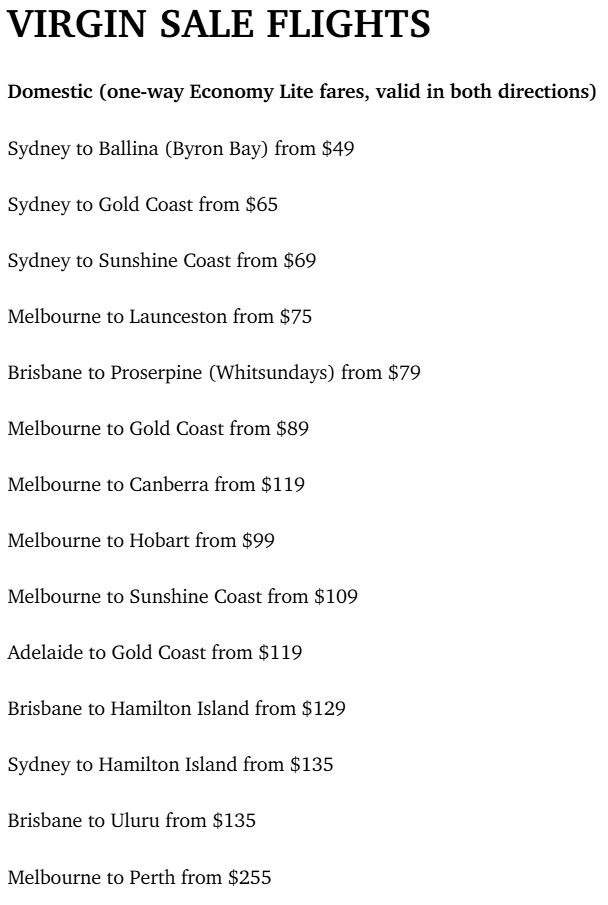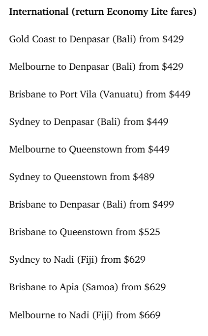 此次为期一周的促销恰逢澳大利亚航空业持续竞争之际,单程机票价格低至49澳元起,涵盖巴厘岛、斐济、瓦努阿图、黄金海岸、Cairns和Hamilton Island等热门航线。