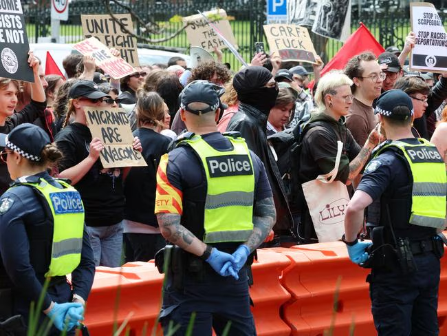 右翼的“澳大利亚游行”支持者从议会大楼出发,高举国旗;而左翼“反种族主义”团体则从州立图书馆出发,试图拦截对方队伍。